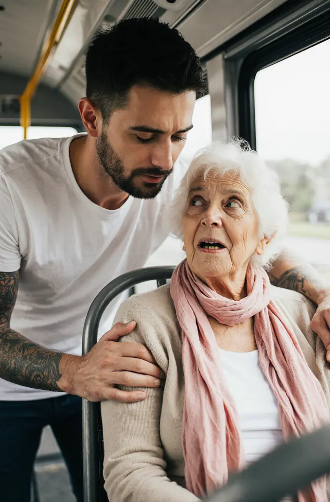 Le moteur rugit doucement lorsque le bus continua sa route, mais tout autour semblait ralenti, chaque seconde étirée. Le jeune homme rassura la vieille dame d’une voix douce, ferme, sans aucune trace de jugement :