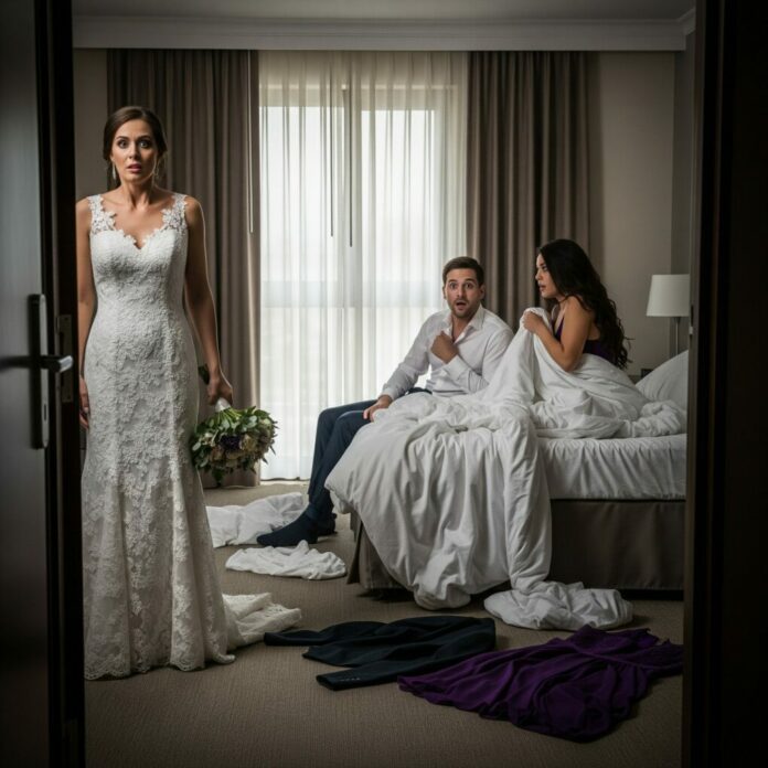 Les rideaux étaient tirés, mais la faible lumière révélait la vérité instantanément : des vêtements éparpillés sur le sol — le costume de Maverick et la robe violette de Penelope, une bouteille de champagne vide sur la table de nuit, des draps en désordre, des corps emmêlés.